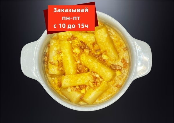 Нежные рисовые палочки токпокки в аппетитном сырном соусе. Мягкие внутри брусочки из рисовой муки создают неповторимую текстуру, а сырно-сливочный соус придает блюду особую пикантность и насыщенность.